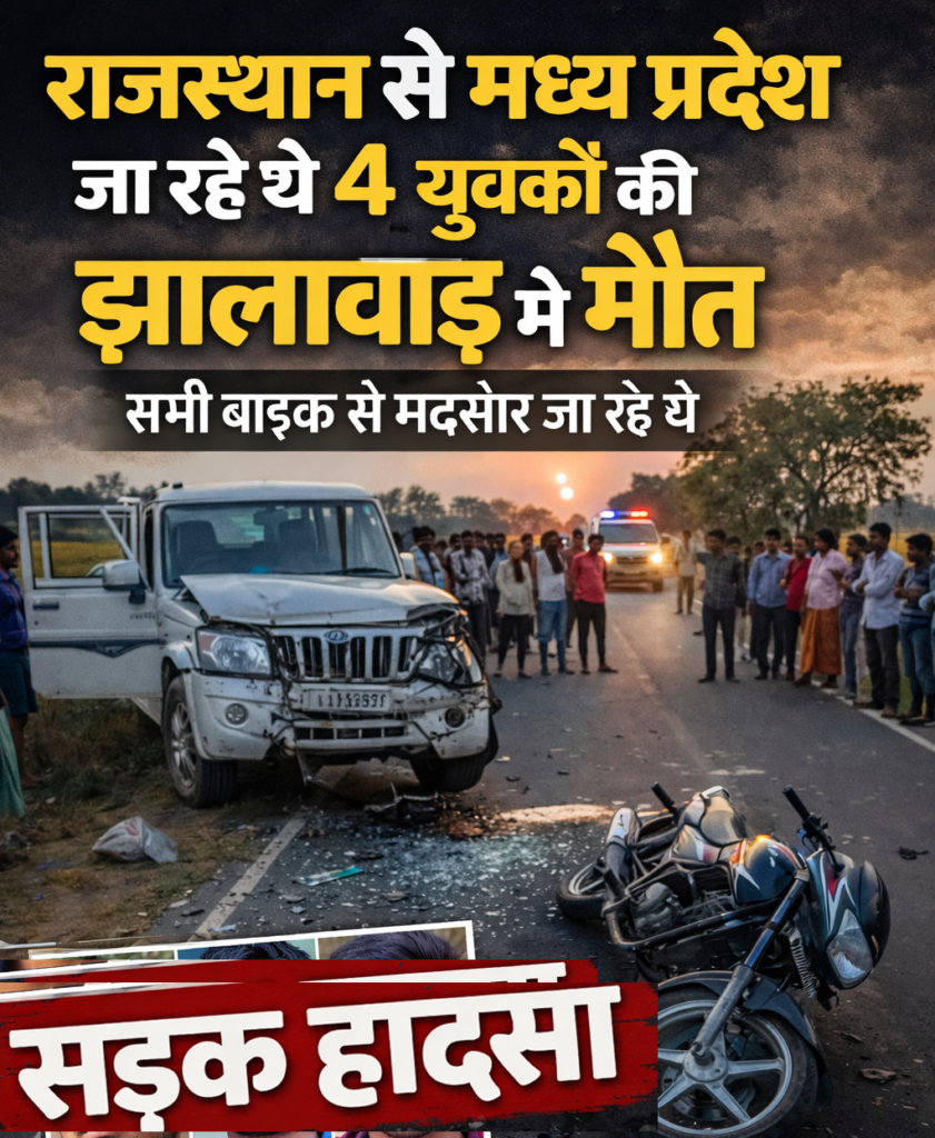 राजस्थान के झालावाड़ जिले में एक दर्दनाक सड़क दुर्घटना में चार लोगों की मौत हो गई। हादसा बोलेरो और बाइक की आमने-सामने की टक्कर के कारण हुआ। बताया जा रहा है कि बाइक पर सवार चारों व्यक्ति राजस्थान से मध्य प्रदेश की ओर जा रहे थे। सूचना मिलने के बाद पुलिस मौके पर पहुंची और शवों को अस्पताल भिजवाया गया। फिलहाल शवों को चौमहला अस्पताल की मॉर्च्युरी में रखवाया गया है। पुलिस के अनुसार मृतकों में से तीन की पहचान दस्तावेजों के आधार पर हो चुकी है, जबकि एक व्यक्ति की शिनाख्त अभी नहीं हो सकी है। हादसा गंगधार थाना क्षेत्र में शाम करीब 7:30 बजे हुआ।