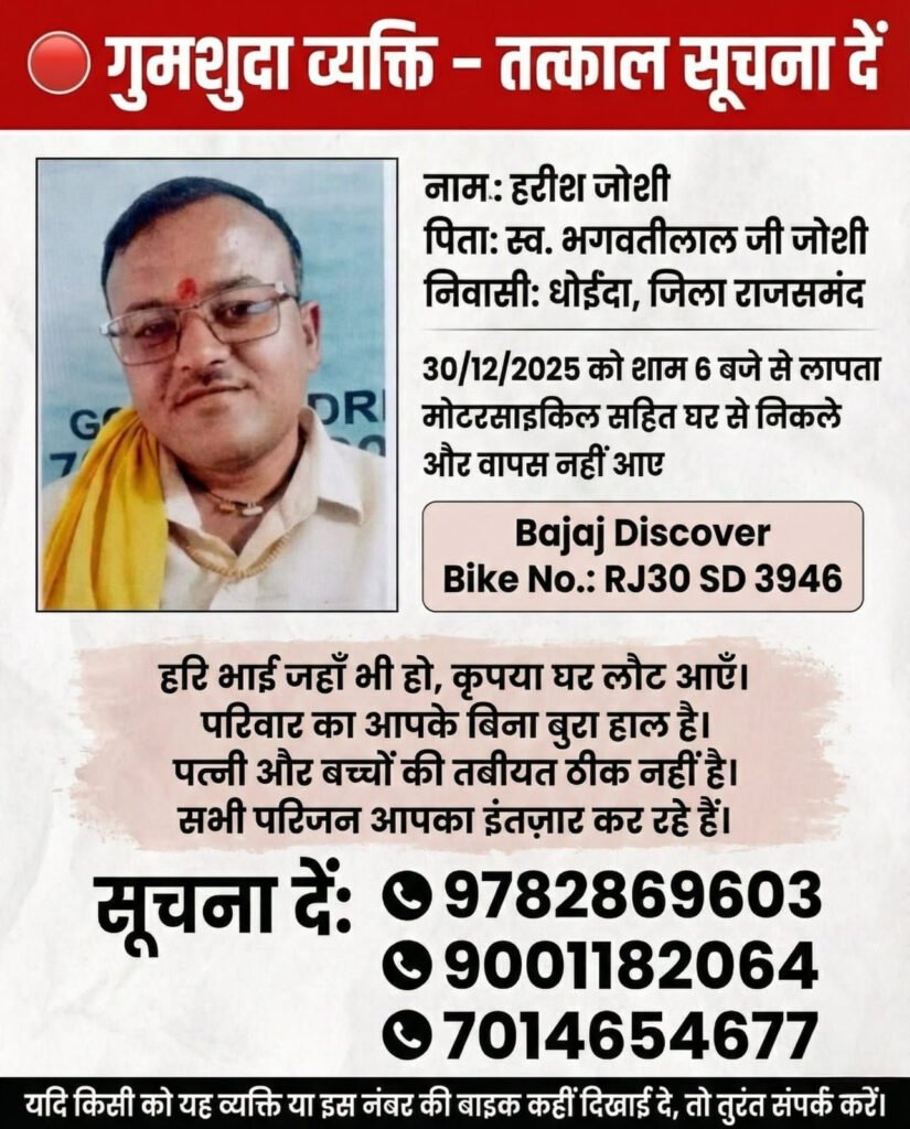 राजसमंद । राजसमंद जिले में धोइंदा निवासी युवक हरीश जोशी के लापता होने का मामला अब एक बड़े जनाक्रोश का रूप ले चुका है। पिछले सात दिनों पूर्व से युवक का कोई सुराग न लगने के कारण परिजनों और स्थानीय लोगों का धैर्य जवाब दे गया है, जिसके चलते धरना स्थल पर माहौल काफी तनावपूर्ण बना हुआ है। इसी बीच जब क्षेत्रीय भाजपा विधायक दीप्ति किरण माहेश्वरी प्रदर्शनकारियों के बीच पहुंचीं, तो उन्हें जनता के भारी विरोध का सामना करना पड़ा।