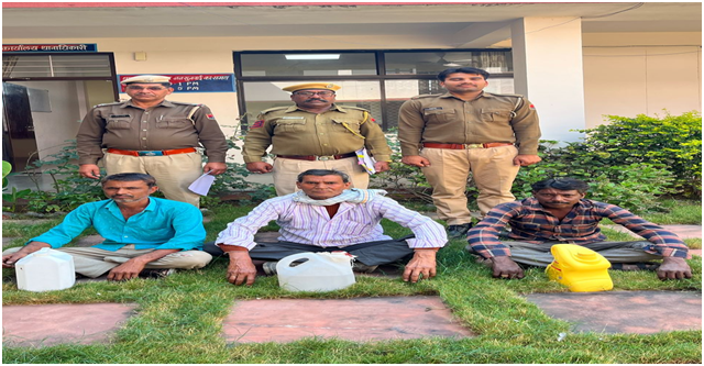 उदयपुर। जिले की घासा थाना पुलिस ने अवैध शराब की धरपकड़ अभियान में अलग-अलग कार्यवाही करते हुए तीन आरोपियों को गिरफ्तार किया। थानाधिकारी प्रवीणसिंह ने बताया कि जिला पुलिस अधीक्षक योगशष गोयल द्वारा अवैध मादक पदार्थो/अवैध शराब की धरपकड हेतु चलाये जा रहे अभियान के तहत अंजना सुखवाल अतिरिक्त पुलिस अधीक्षक,खेरवाडा व मनीष कुमार सहायक पुलिस अधीक्षक वृत्त मावली के सुपरविजन में थानाधिकारी प्रवीणसिंह मय टीम ने आरोपी हरीसिंह पिता भूरसिंह निवासी बाडाबाबडी थाना घासा के कब्जे से पांच लीटर हथकड महुआ की शराब जब्त कर मामला आबकारी अधिनियम के तहत दर्ज किया गया एवं आरोपी जगदीश पिता गांगा निवासी मांगथला थाना घासा के कब्जे से पांच लीटर हथकड महुआ की शराब जब्त कर मामला 54 आबकारी अधिनियम के तहत दर्ज किया गया तथा अभियुक्त पूरणमल पिता लच्छीराम निवासी बापेर थाना घासा के कब्जे से 5 लीटर हथकड महुआ की शराब जब्त कर आबकारी अधिनियम के तहत दर्ज किया जाकर आरोपियों से अनुसंधान किया जा रहा है।