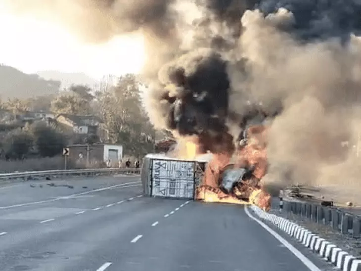 डिवाइडर तोड़ टैंकर कंटेनर से टकराया, दोनों में लगी भीषण आग