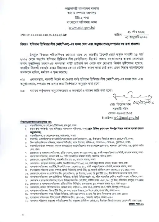 मुस्तफिजुर को हटाने पर भड़का बांग्लादेश बांग्लादेश सरकार ने अपने आधिकारिक बयान में कहा कि बीसीसीआई ने 26 मार्च से शुरू होने वाले आईपीएल सीजन के लिए मुस्तफिजुर रहमान को टीम से बाहर करने का निर्णय बिना किसी ठोस या तार्किक कारण के लिया है। मंत्रालय के अनुसार, यह फैसला बांग्लादेश की जनता के लिए अपमानजनक और दुर्भाग्यपूर्ण है। इसी के विरोध में बांग्लादेश में आईपीएल के मैचों के प्रचार, प्रसारण और पुनः प्रसारण पर अगले आदेश तक रोक लगा दी गई है।