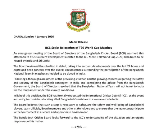 वर्ल्ड कप में भी अड़ंगा, टीम भेजने से इनकार विवाद यहीं नहीं थमा, रविवार 4 जनवरी को बांग्लादेश क्रिकेट बोर्ड ने एक और बड़ा एलान करते हुए टी-20 वर्ल्ड कप के लिए अपनी टीम को भारत भेजने से इनकार कर दिया। बीसीबी ने अंतर्राष्ट्रीय क्रिकेट परिषद (ICC) से आधिकारिक अनुरोध किया है कि बांग्लादेश के सभी मैच भारत के बजाय श्रीलंका में आयोजित किए जाएं। खेल जगत में इस फैसले को भारत और बांग्लादेश के क्रिकेट संबंधों में अब तक की सबसे बड़ी दरार के रूप में देखा जा रहा है।
